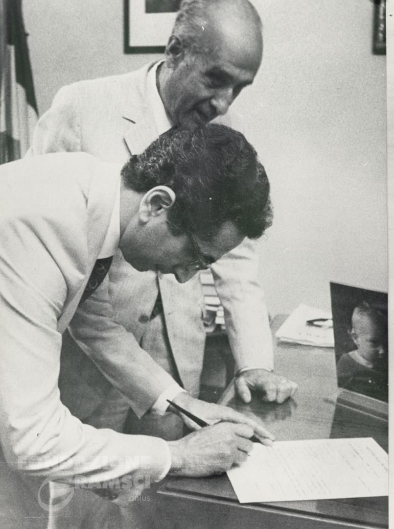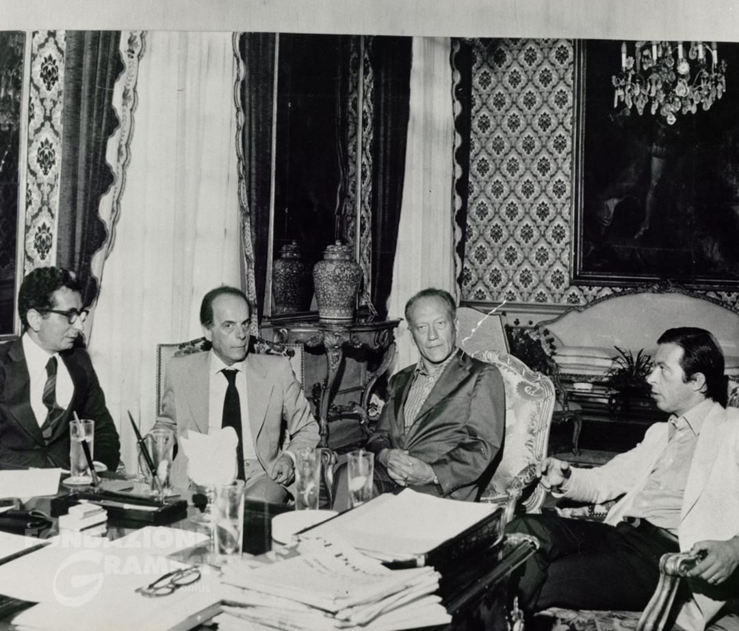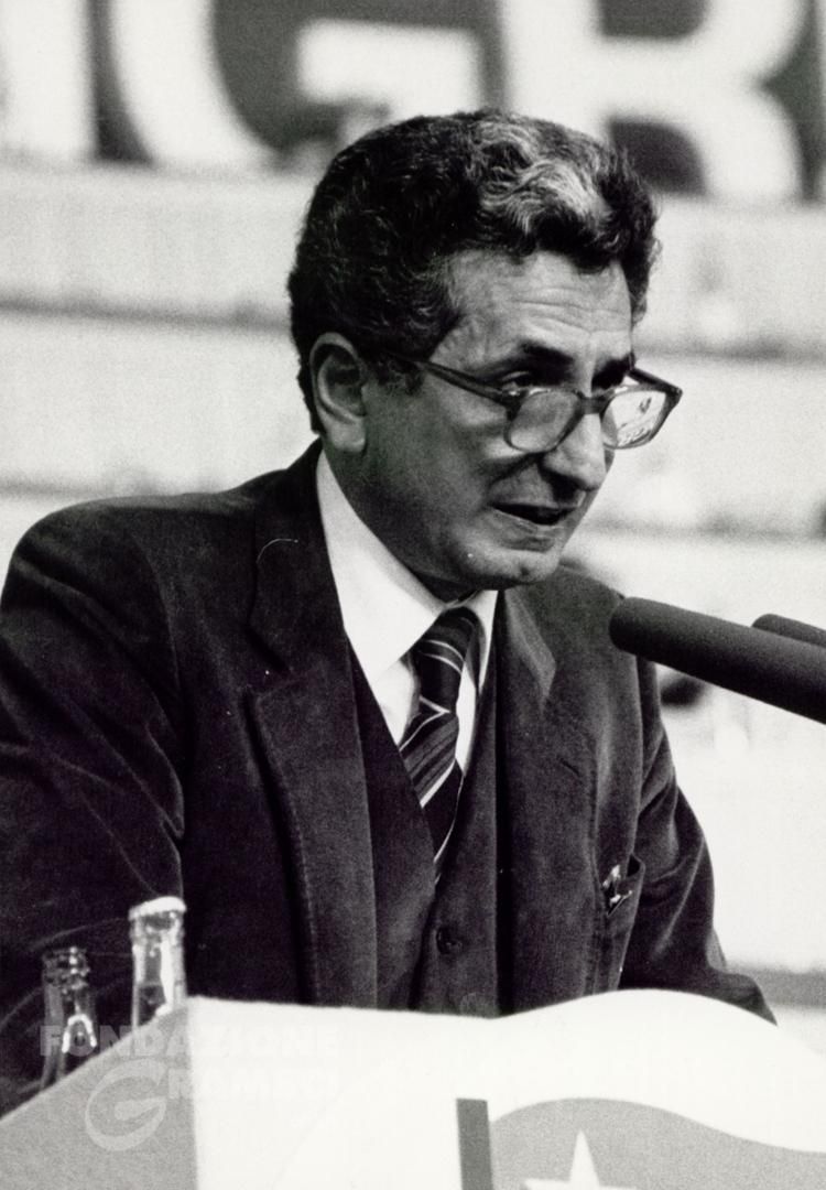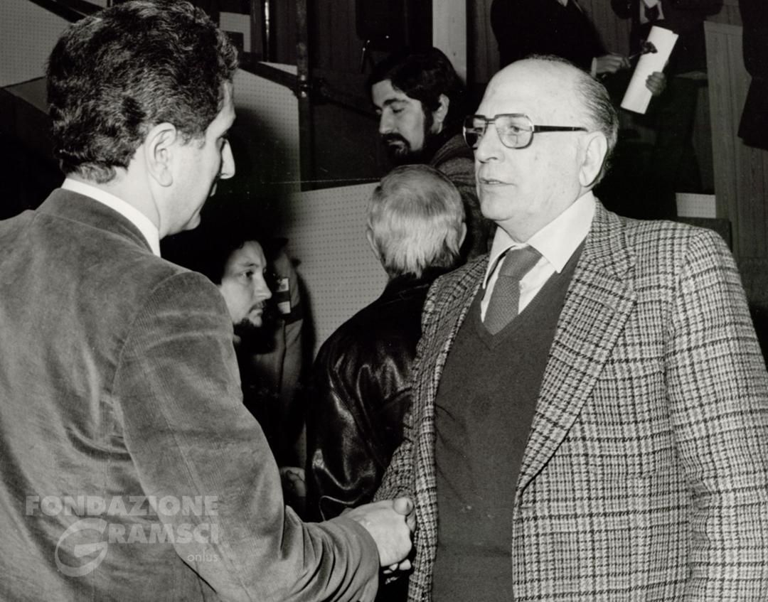 Diego Novelli, in piedi dietro al tavolo dei relatori, interviene al microfono. Seduti accanto a lui Renato Nicolini, Armando Cossutta, Luigi Petroselli, Maurizio Valenzi.