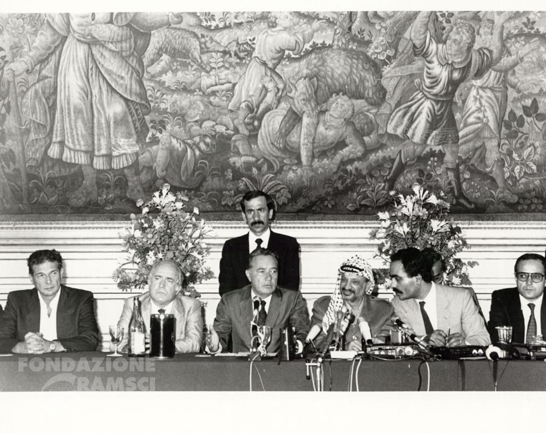 Roma – Yasser Arafat durante una conferenza stampa. Al tavolo dei relatori, seduti accanto a lui, tra gli altri Luciano Lama e Silvano Labriola. Autore della foto: Palma, Angelo