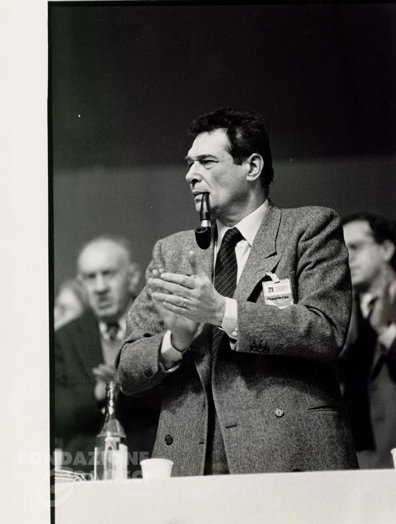 Palazzo dello sport di San Siro, Milano – Luciano Lama applaude in piedi dietro ai banchi della presidenza del Congresso. Autore della foto: Ponzio, Fabio – Agenzia Contrasto