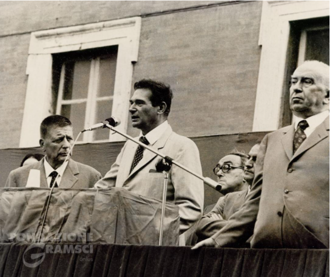 Cimitero del Verano, Roma. Luciano Lama interviene al microfono dalla tribunetta. Tra i presenti sul palchetto Giorgio Amendola e Luigi Longo. Autore della foto: Ravagli, Piero
