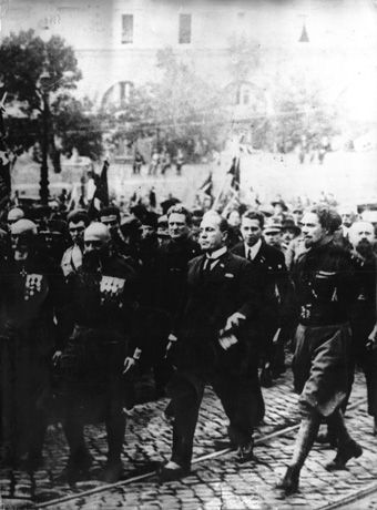 Il 28 ottobre 1922 i fascisti marciano su Roma. Una parata coi quadrunviri Emilio de Bono, Cesare Maria de Vecchi, Benito Mussolini e Italo Balbo.