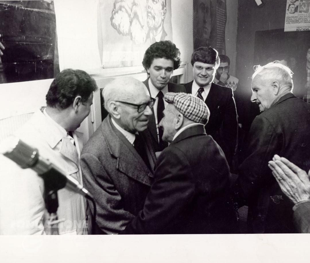 Roma, 1980. Umberto Terracini saluta un compagno durante la visita alla sezione di Tor de’ Schiavi.